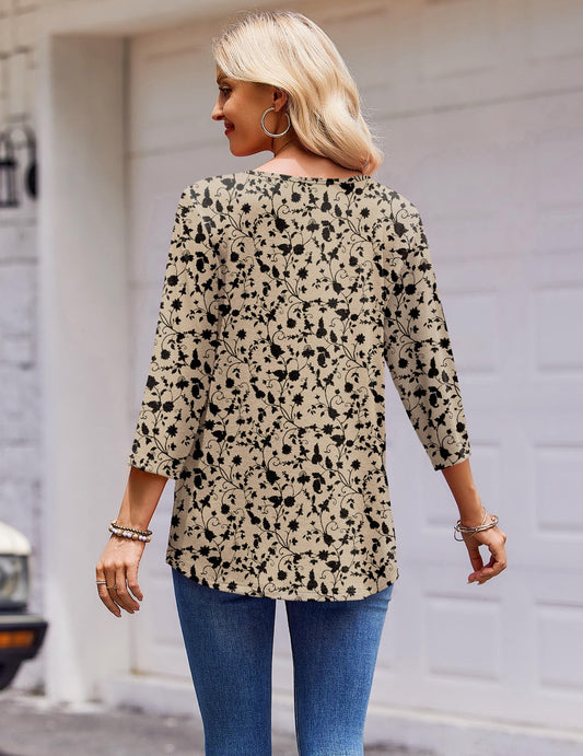 Zeagoo Ladies Tops and Blouses 3/4 sleeve Plus Size Floral Print Crew Neck Blouses Casual T-Shirt For Spring Summer Oversized Women's Work Clothing Beige