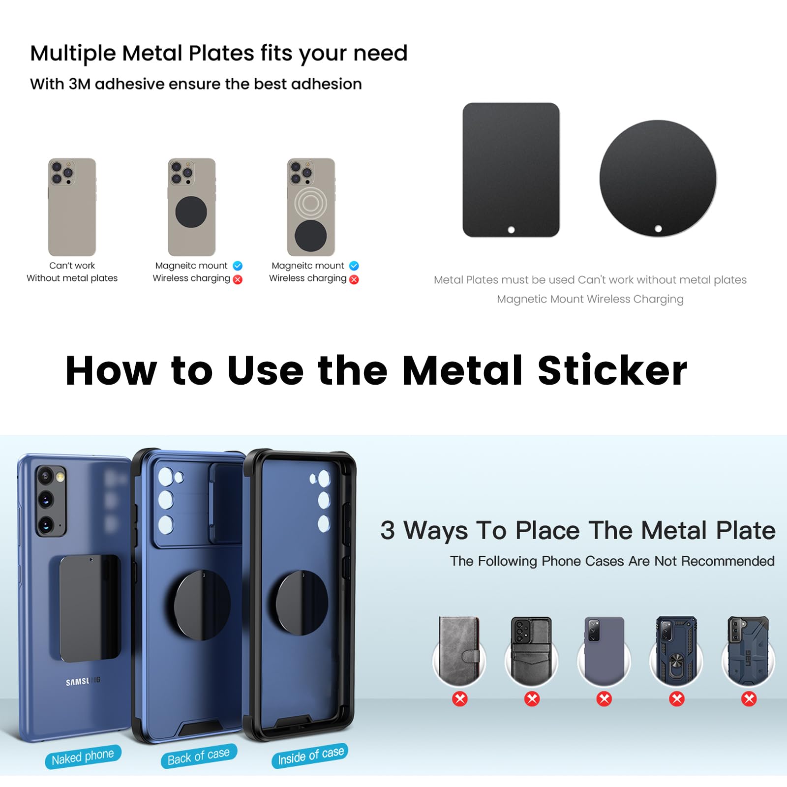 - Installation Steps for the Metal Plate: 1-Stick the metal plate to the outside of the phone case. 2. Press down on the plate for 10 seconds to ensure a secure bond. 3. Wait for 24 hours to allow the adhesive to fully set before attaching the magnetic phone holder.