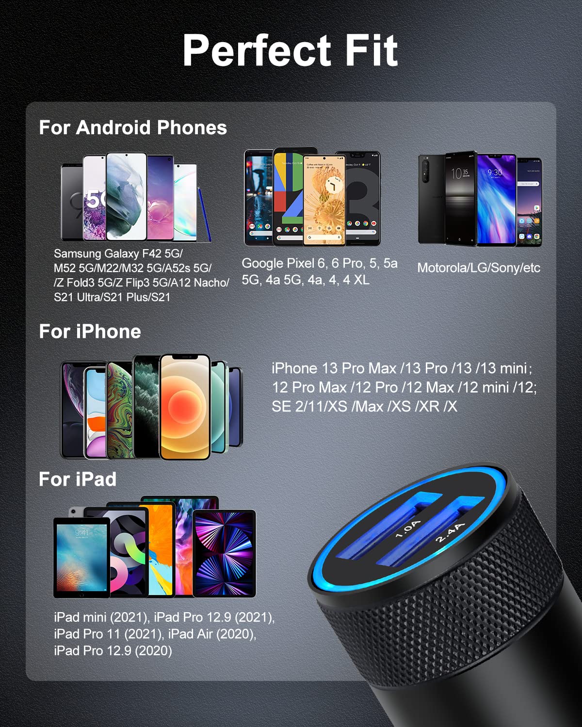 - 【Wide Compatibility】- USB A car charger works for the latest smartphones or tablets, iPhone Air 17 16e/16/16 Pro/16 Pro Max/16 Plus/15/15 Pro/15 Pro Max/15 Plus/14 Pro Max/14 Pro/14 Plus/13/13 Pro/12/12 Mini/12 Pro Max/SE, iPad Pro/Air/Mini; Samsung Galaxy S25/S25+/S25 Ultra/S24/S24+/S24 Ultra/S23/S23+/S23 Ultra/S22/S22+/S22 Ultra/Note 20 Ultra/S20/S10/A17/A16/A15/A14; Google Pixel 10 Pro XL/10 Pro/10/10 Pro Fold/9 Pro XL/9/9 Fold/8 Pro/8/7 Pro/7; OnePlus, Motorola, Kindle, Smartwatches, etc.