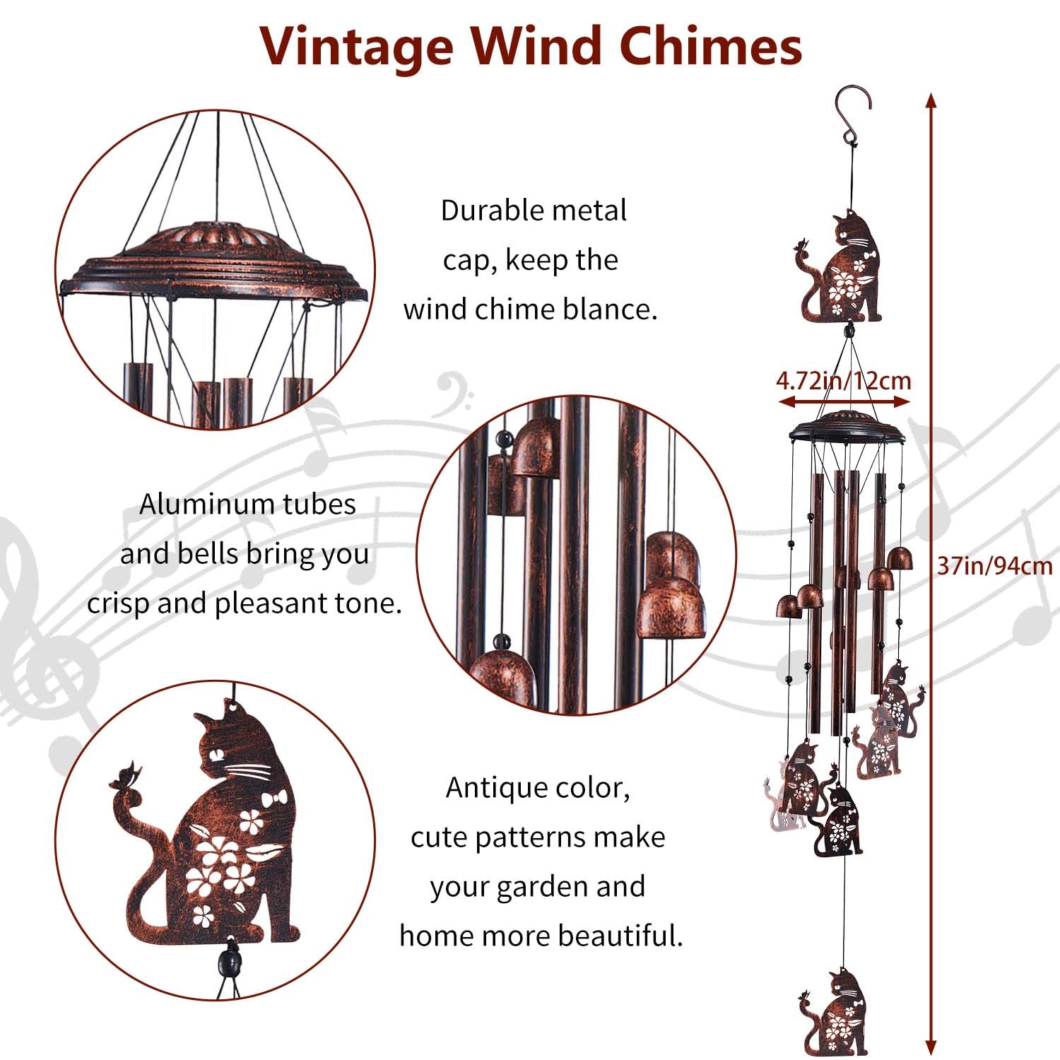 - Elegant Cat Wind Chimes: Cat wind chimes crafted with a charming design, comprising a large cat, 6 small cats, 1 S hook, 1 metal cap, 4 aluminum tubes, and 6 bells, creating a soothing melody when the breeze passes. The wind chime simple design and vintage aesthetic infuse a unique artistic charm, making them a captivating centerpiece for both indoor and outdoor spaces.