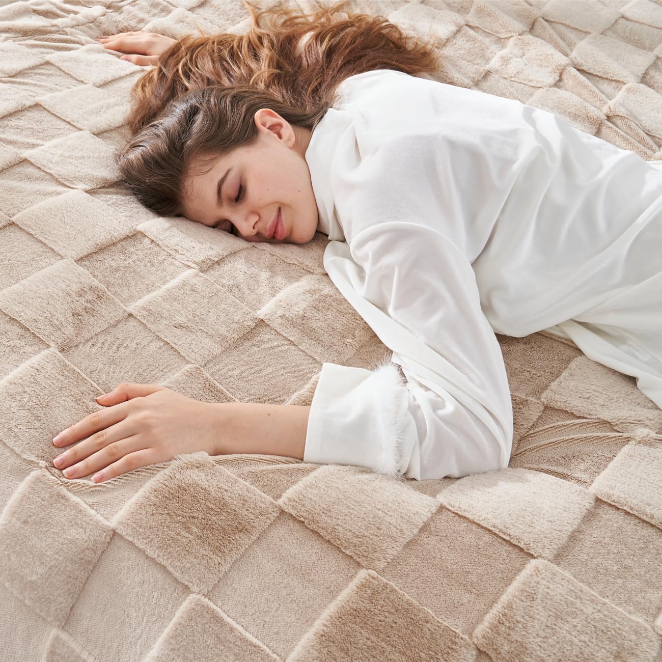 Cozy Bliss Checkered Faux Rabbit Fur Blanket King Size for Bed, Soft Fuzzy Blankets for Women Men, Large Furry Fleece Throw for Bedroom Decor (Tan, 108" x 90")