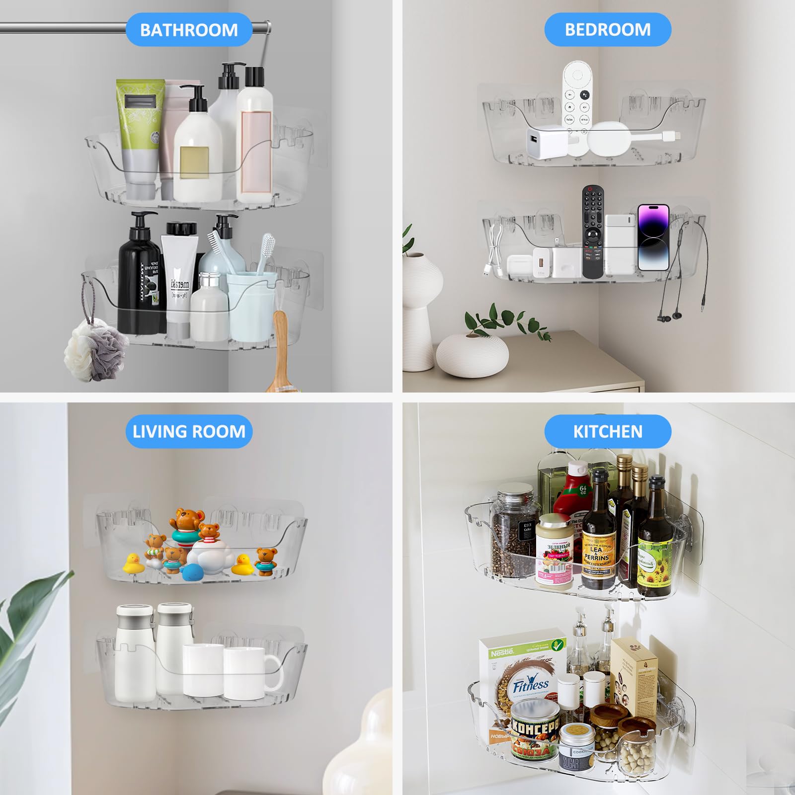 EEKEDO Corner Shower Caddy, 2 Pack Clear Acrylic Corner Shower Shelves Adhesive No Drilling Wall Mounted Shower Rack with Hooks for Bathroom Shampoo Organizer Kitchen Holder