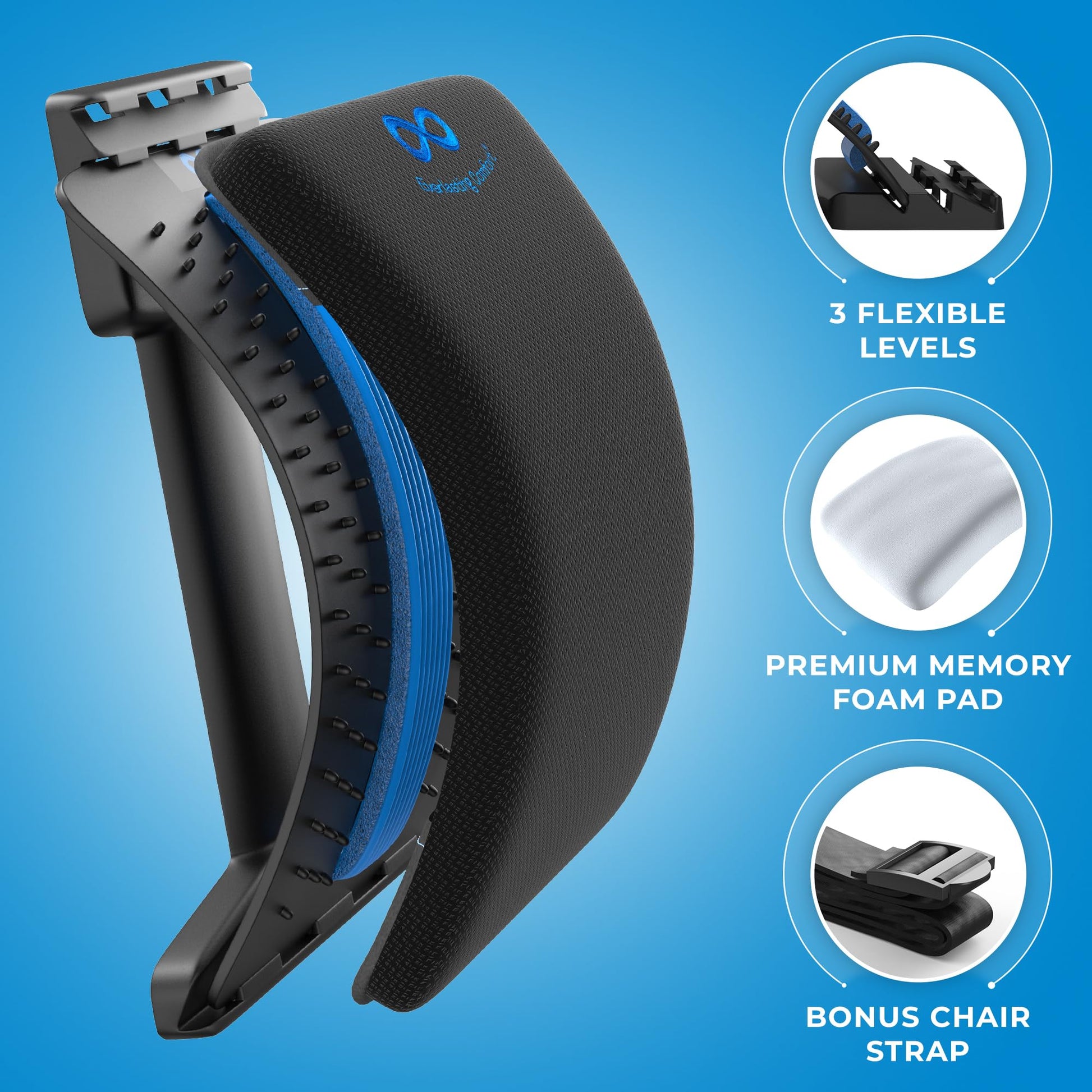 - BUILT FOR OPTIMAL COMFORT AND BACK SUPPORT: Designed for everyday back care, our lumbar stretcher includes a soft traction strip and foam pad for added cushioning. The breathable 3D mesh cover is removable and machine washable. Use this back support stretcher at home or in the office to target lower lumbar discomfort while maintaining an ergonomic position, a lumbar support board or back popper during your stretch. Can use while driving, on neck, omes with a strap to place on your chair