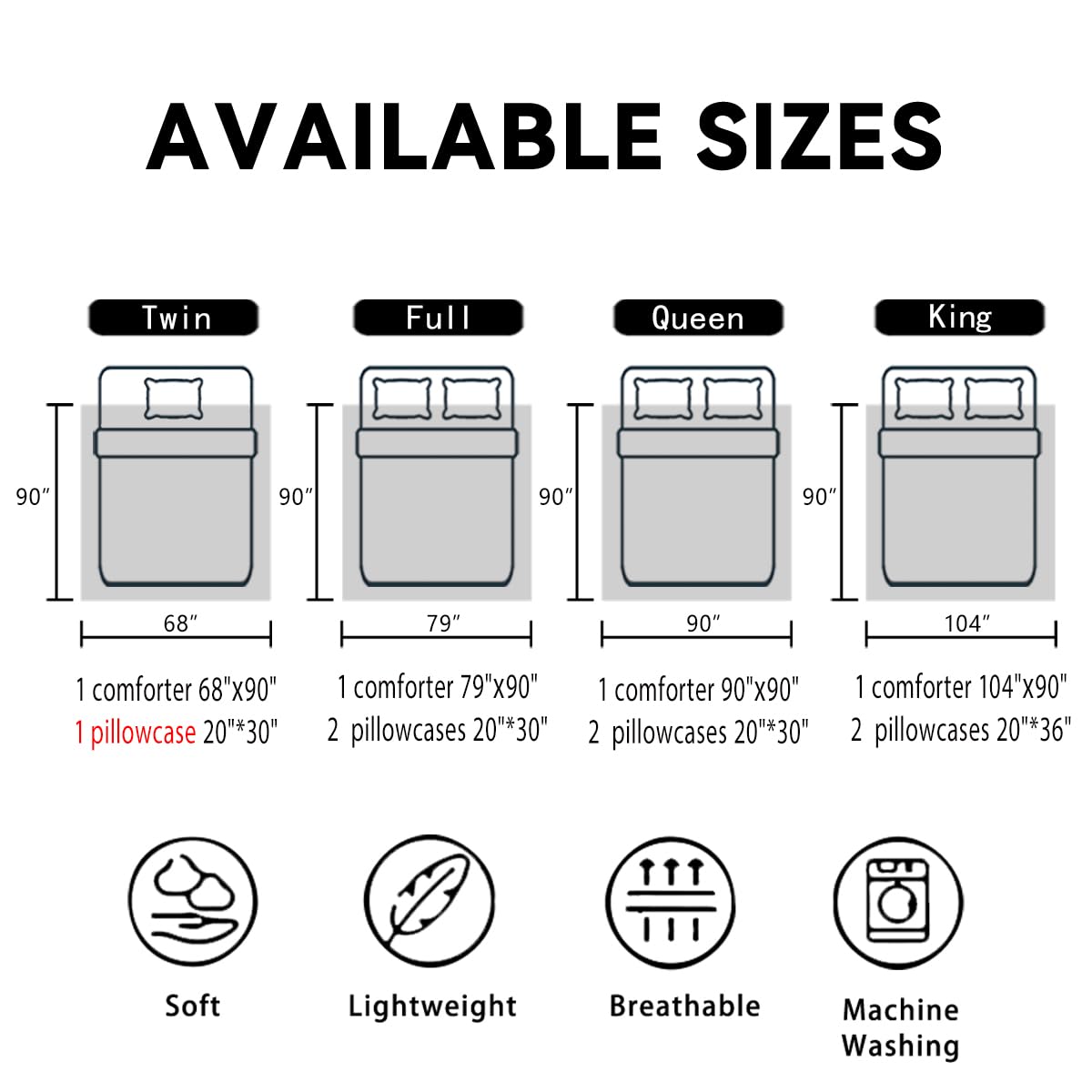 - Size: Twin size includes 1 comforter 68"x90", 1 pillowcase 20"x30"; full size includes 1 comforter 79"x90", 2 pillowcases 20"x30"; queen size includes 1 comforter 90"x90", 2 pillowcase 20"x30"; king size includes 1 comforter 104"x90", 2 pillowcase 20"x36"