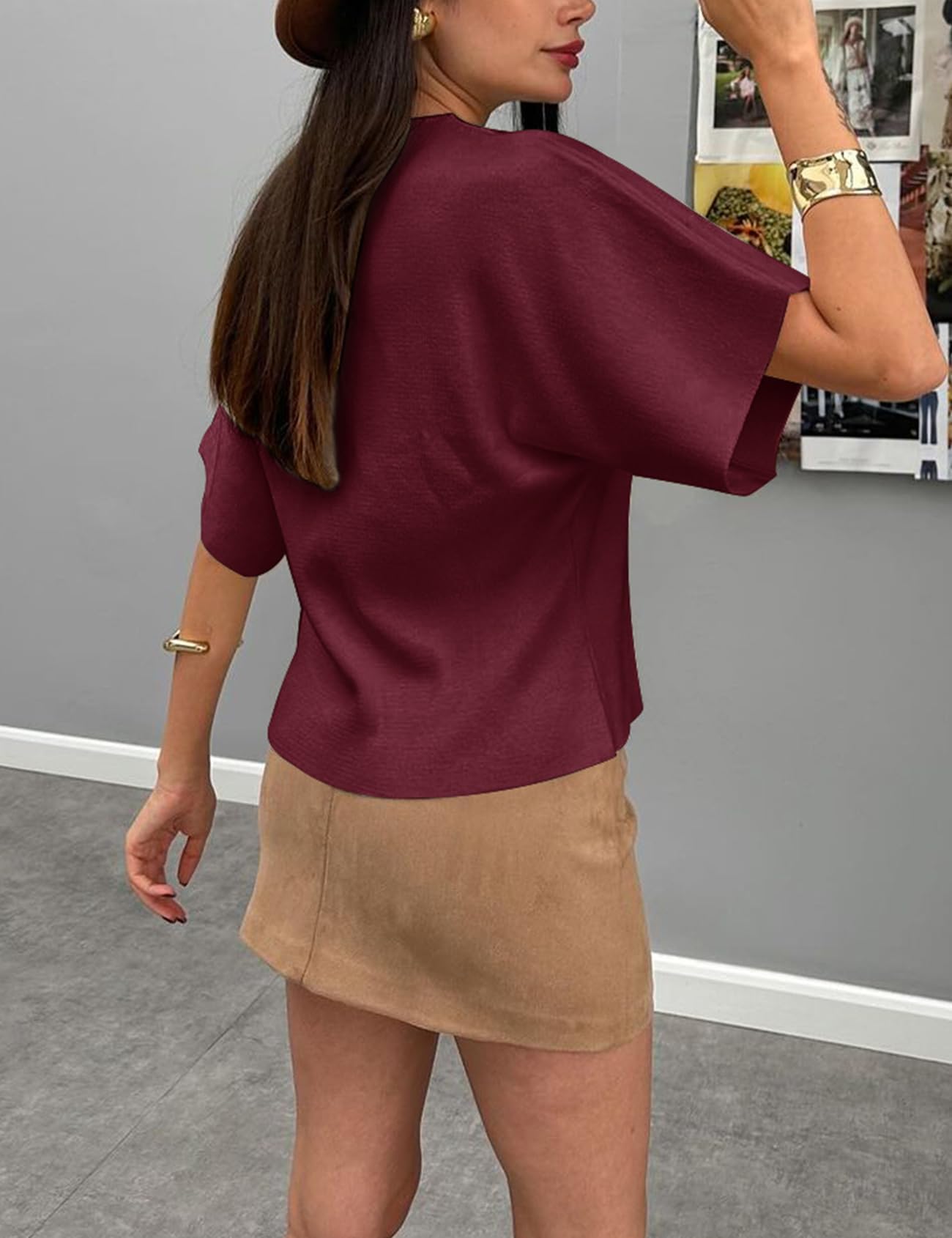hathne Women's V Neck Short Sleeve Cardigan Sweater Button Down Ribbed Knit Tops(Wine Red,S
