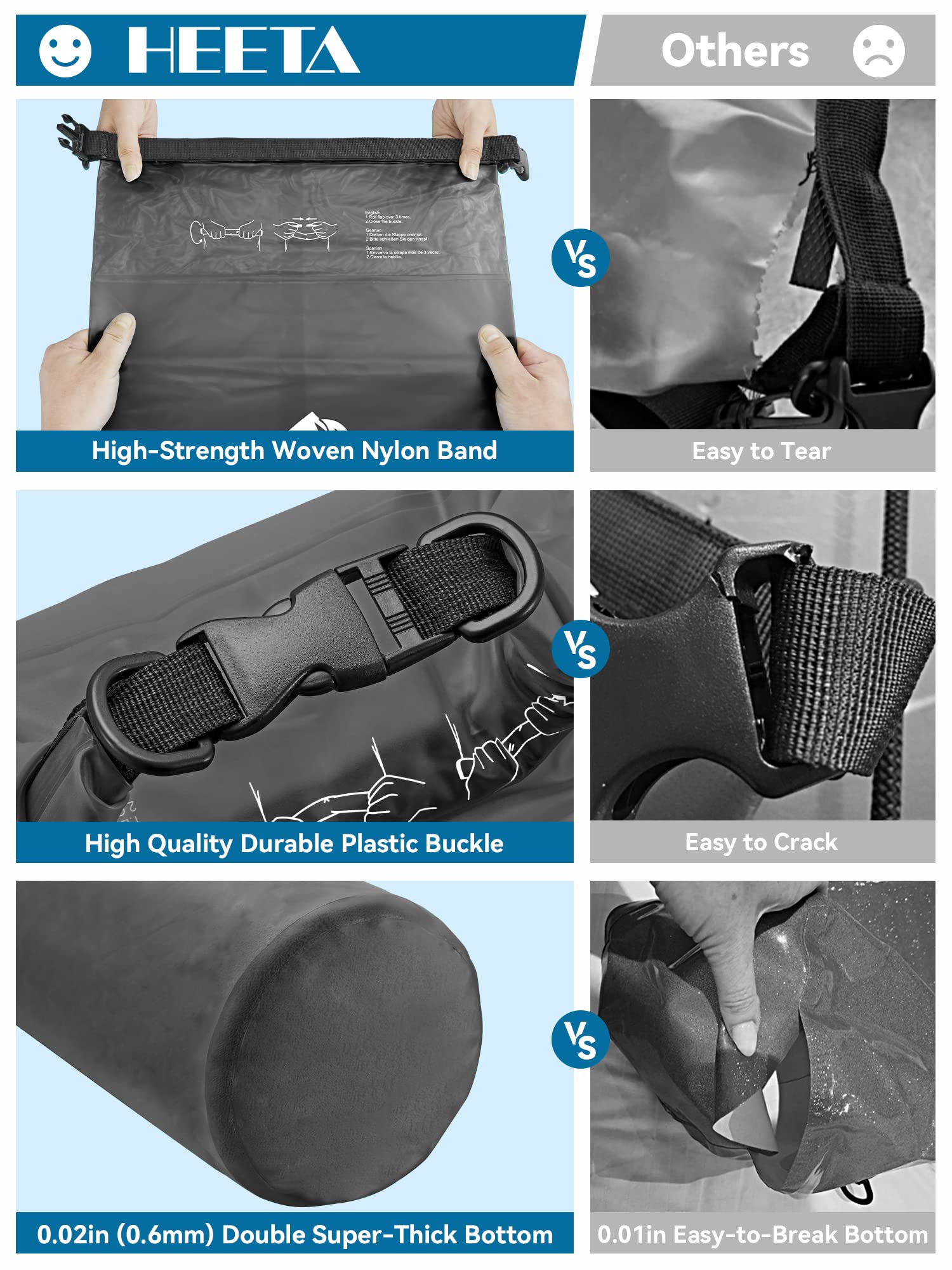 - Durable - Made with wear-resistant PVC material: 0.6 mm thick at the bottom and 0.3 mm on the sides, this waterproof bag is easy to wipe clean and suitable for all kinds of weather and environment. Comfortable to carry during long outdoor activities