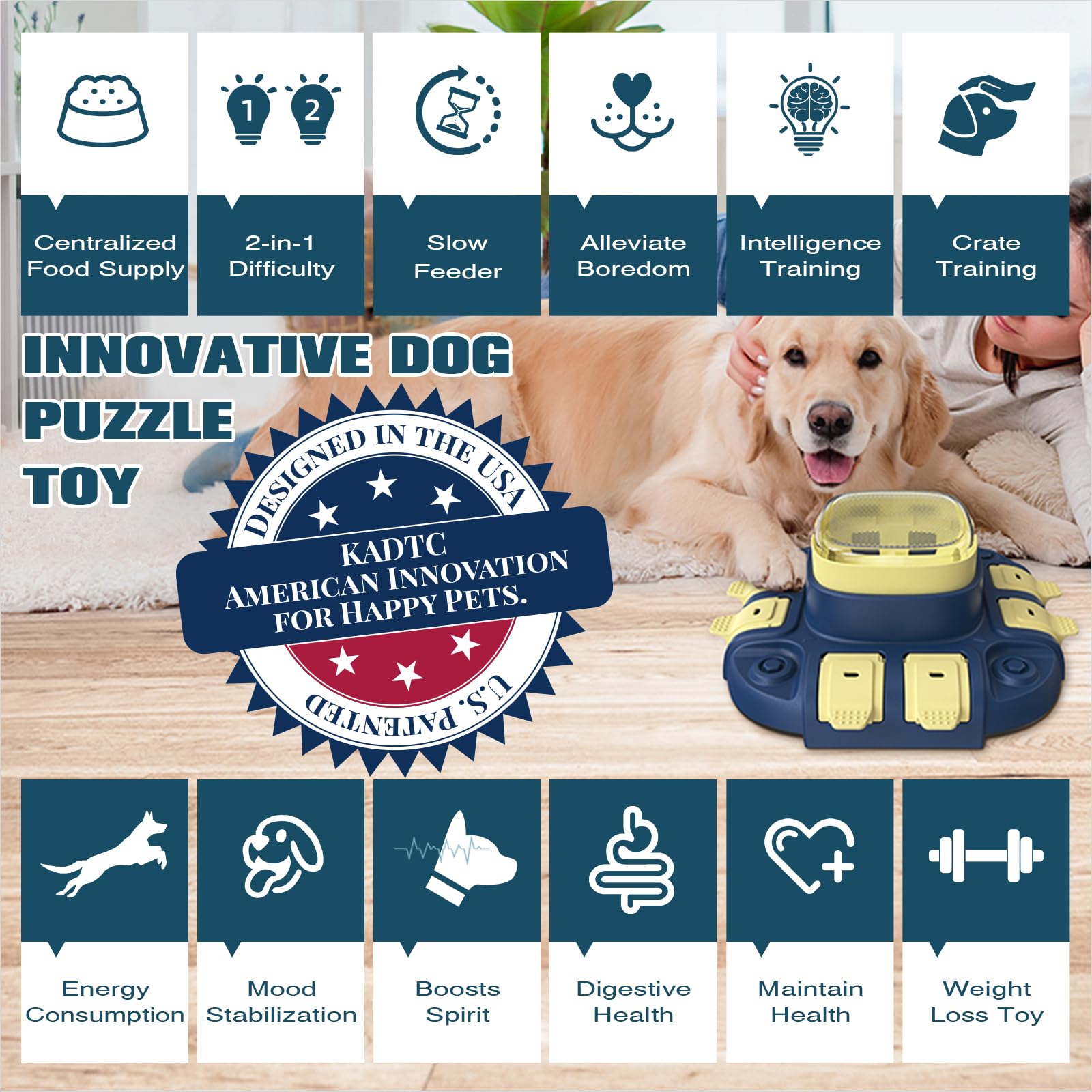 - [Dog Puzzle Toy from the United States, an American Brand with a U.S. Patent][Innovative Dog Puzzle Toy]This perfect dog snack toy also doubles as a true slow feeder for dogs. Unlike traditional pet toys, this toy features a centralized food supply design, allowing pets to dispense food by pressing on the top cover. It can hold 8.82 ounces of food and functions as a slow feeder, with 2-in-1 difficulty levels—from level 1 to level 2, all within the same toy. Give your beloved dog the perfect gift—KADTC puzzle toys for birthdays and every special holiday!
