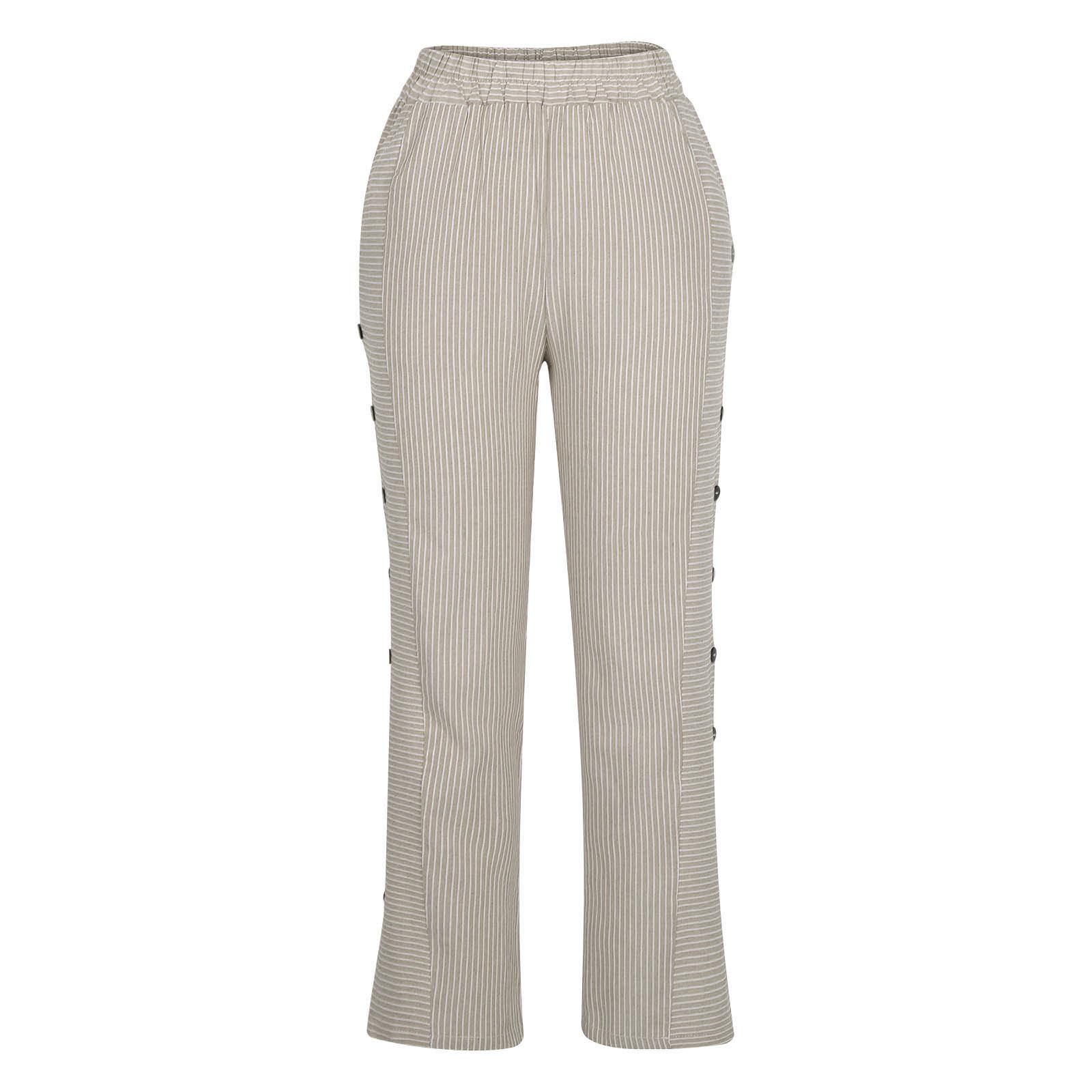 Striped Linen Pants for Women Plus Size Elastic Waist Straight Leg Trousers Side Button Casual Beach Vacation Pant Khaki L