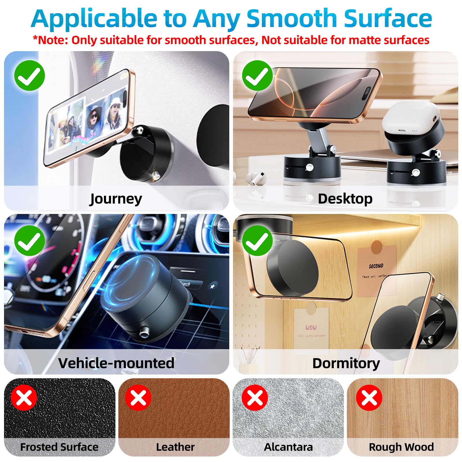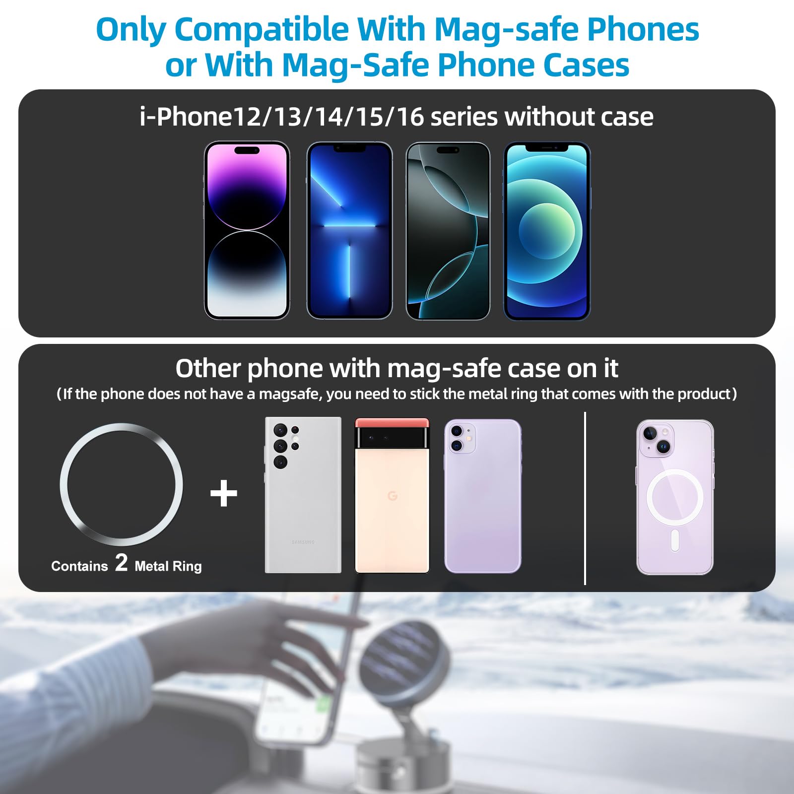 - 【Universal Cell Phone Holder】2025 New Car Suction Cup Vacuum Magnetic Phone Holder mount can be used directly on iPhone 16/15/14/13/12 and Pro Max mini-series. In addition, we offer metal rings for non-magnetic phones and phone cases. Glue the metal ring to the back of the phone or phone case and let it stay for 24 hours to maximize adhesion.