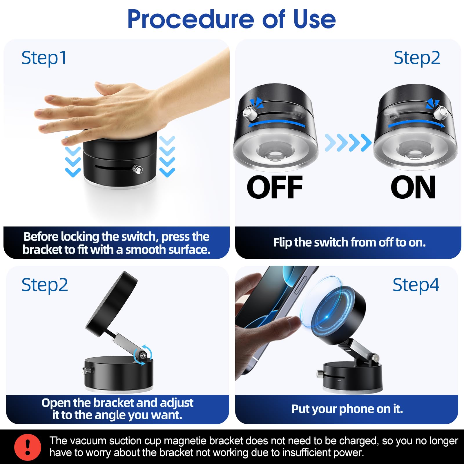 - 【No Charging, One Button Switch】The vacuum magnetic phone holder advanced vacuum suction technology, allowing for hands-free operation on various smooth surfaces.Just push it and it will be sucked. Release the pressure with one button and you can take it easily. No Charging Needed, Always ready to use. Designed to be compact and light, made the suction cup magnetic car phone holder is easy to carry with you wherever you go.