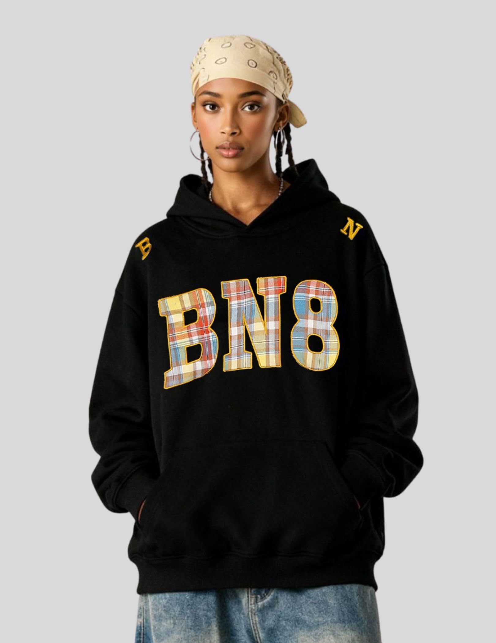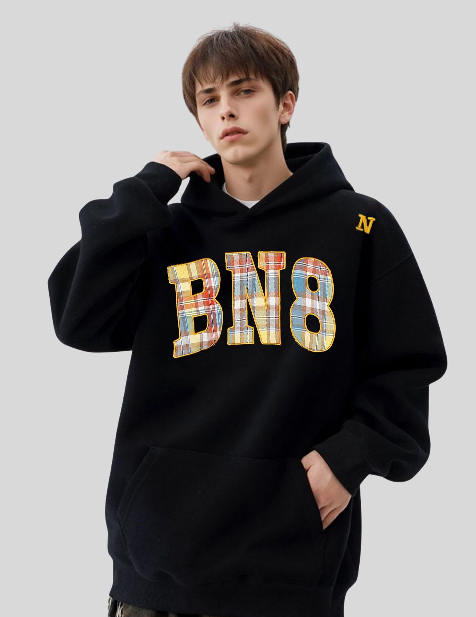 - Design: Plaid Number Print, embroidery, pullover hooded, long sleeve, front pocket, ribbed hem